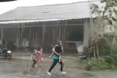 Khoảnh khắc người cha vội vã cùng 3 người con đi tránh bão ở Tuyên Quang khiến người xem xúc động.