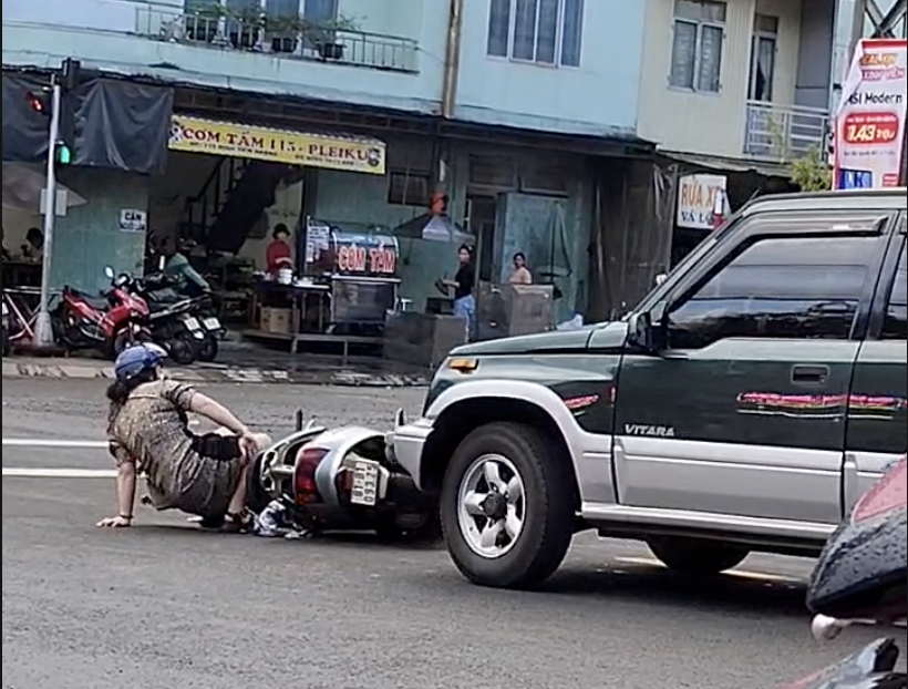 Xe máy do người phụ nữ điều khiển, chở theo trẻ nhỏ đang dừng phía trước nhưng xe 5 chỗ cố tình tông ngã rồi rời khỏi hiện trường.
