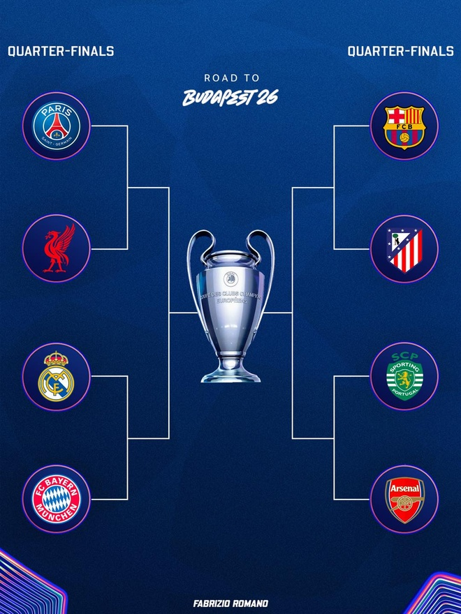 Vòng tứ kết Champions League 2025/26 diễn ra vào rạng sáng 8 và 9/4, lượt về diễn ra sau đó một tuần.