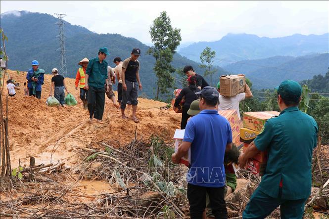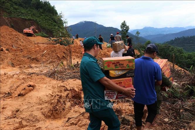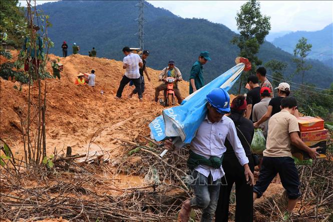 Tuyến Quốc lộ 40B bị sạt lở nặng, tuyến đường nối từ vùng đồng bằng về nhiều khu vực miền núi bị đình trệ hoàn toàn, hàng hóa tiếp tục được vận chuyển bằng sức người. |