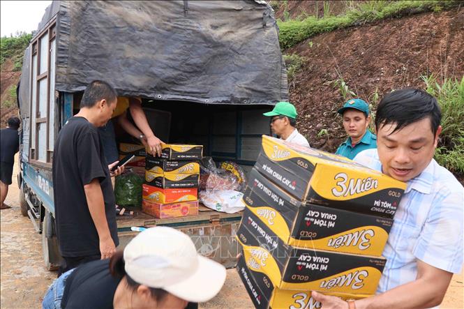 Hàng hóa được chuyển đến điểm đầu sạt lở, sau đó các lực lượng vận chuyển chuyền tay nhau, mỗi người vận chuyển một đoạn, rồi tiếp tục chuyển cho người khác, để vượt qua hơn 200 mét đường bị bùn đất do sạt lở núi vùi lấp. |