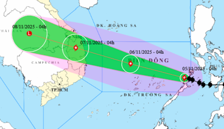 Trung tâm Dự báo khí tượng thủy văn quốc gia nhận định khoảng chiều ngày 6-11, bão số 13 Kalmaegi sẽ di chuyển vào vùng biển miền Trung và khoảng từ đêm ngày 6-11, bão có khả năng ảnh hưởng trực tiếp khu vực từ Đà Nẵng đến Khánh Hòa, gây gió mạnh (vùng ven biển có thể có gió bão mạnh từ cấp 10-12, giật cấp 15, sâu trong đất liền có khả năng có gió bão mạnh cấp 7-9, giật cấp 13-14) và mưa lớn từ đêm 6-11 đến 9-11, khu vực mưa to tập trung ở các tỉnh từ Quảng Trị đến Đắk Lắk.