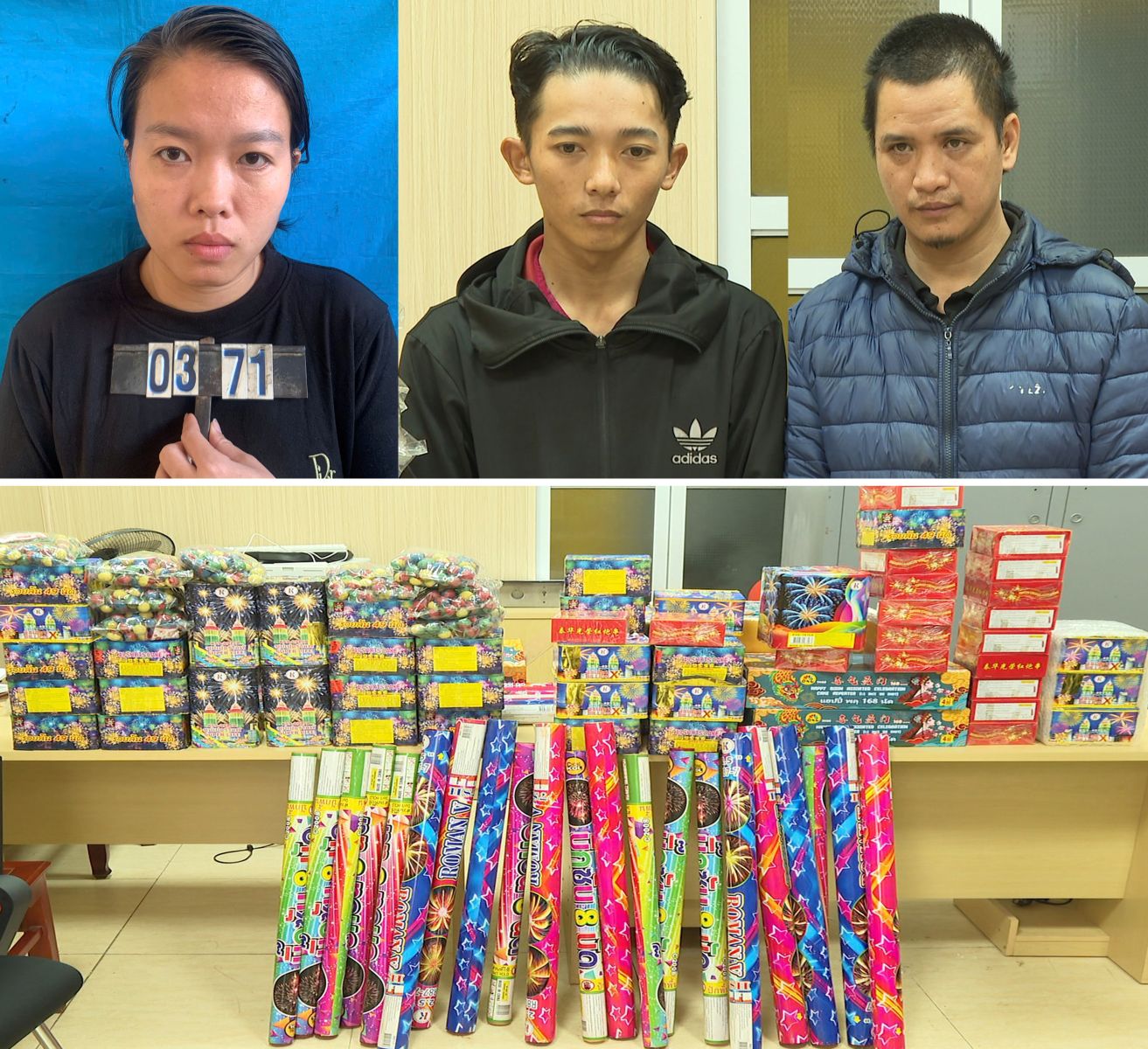 3 người bị bắt tạm giam cùng tang vật là pháo nổ nhập lậu. Ảnh: Công an Thanh Hóa |