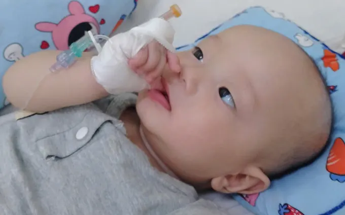 Chị Kim rớm nước mắt kể, bản thân chị vốn bạo bệnh, phải cắt bỏ một quả thận, hiện thân thể yếu ớt, mất sức lao động. Còn anh Chương làm thợ hồ nên thu nhập bấp bênh, quanh năm thiếu thốn. Hai vợ chồng sinh được 2 người con, cháu lớn 5 tuổi, cháu nhỏ là Nguyễn Phan Hữu Thịnh, 6 tháng tuổi (ảnh). Cháu Thịnh mới lọt lòng mẹ chưa đầy 3 tháng thì bất ngờ đổ bệnh.
