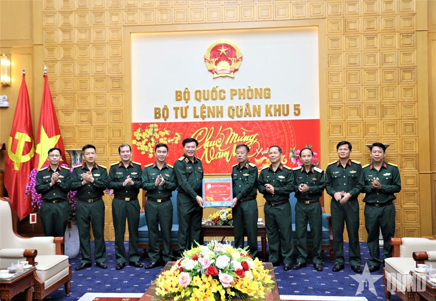 Thiếu tướng Vũ Hữu Hanh tặng quà chúc Tết Bộ tư lệnh Quân khu 5. |