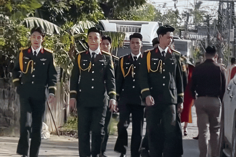Là đồng nghiệp của chú rể Thế Duy, dàn chiến sĩ văn công thuộc Đoàn văn công Quân khu 1 thu hút sự chú ý của quan khách trong đám hỏi hôm 29/11