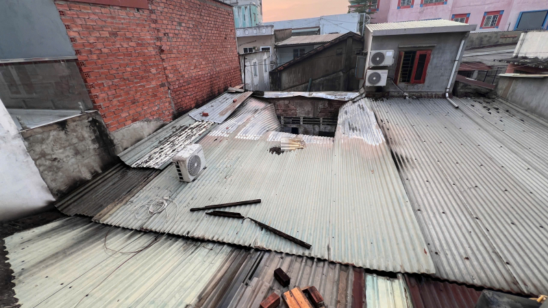 Lực lượng chữa cháy phá mái tôn để khói và lửa thoát ra ngoài. |