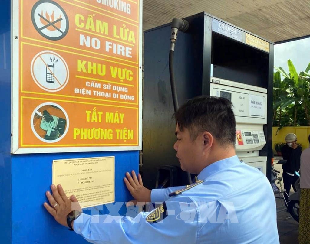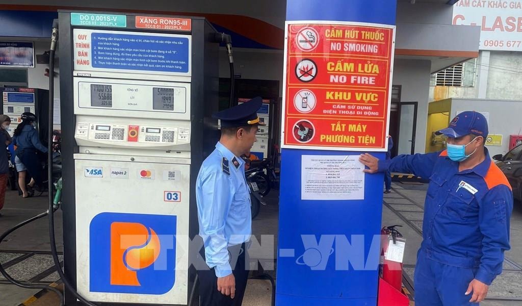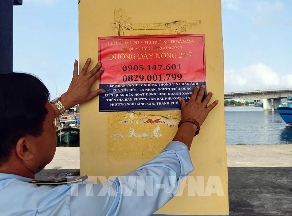 Lực lượng quản lý thị trường thành phố Đà Nẵng triển khai dán thông báo số điện thoại đường dây nóng, tại các cửa hàng xăng, dầu. Ảnh: Trần Tĩnh - TTXVN |