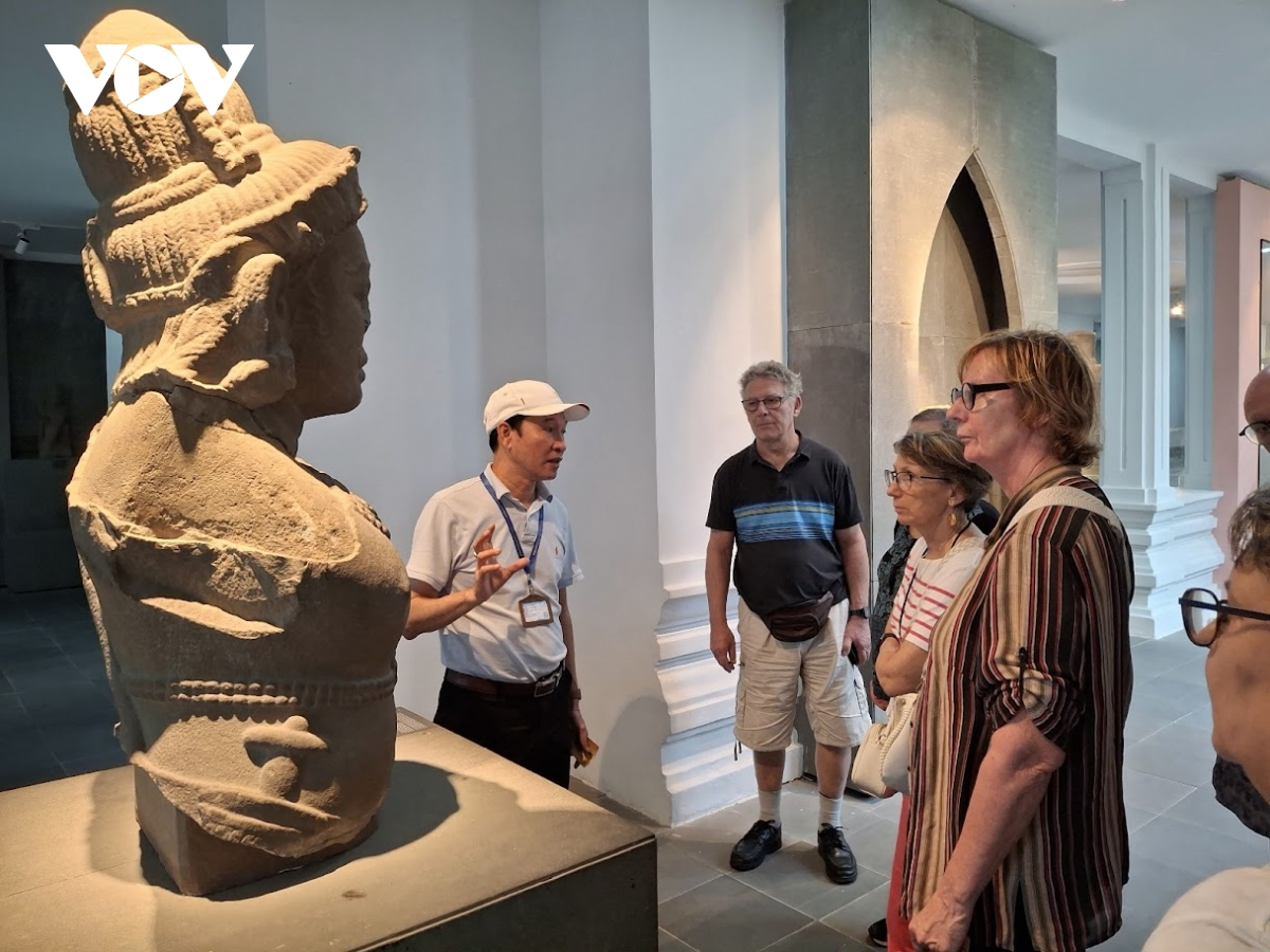 Khách du lịch nước ngoài tham quan Bảo tàng Điêu khắc Chăm Đà Nẵng. |