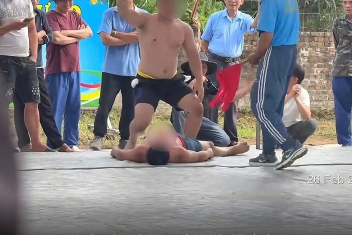 Nạn nhân bị gãy cổ nằm ở sàn đấu. Ảnh cắt từ clip |