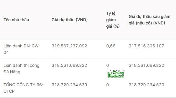 Trong số đó, Liên danh DN-CW-04 đưa ra mức chào 319,567 tỷ đồng và giảm giá 0,66%, hạ giá dự thầu xuống 317,516 tỷ đồng – thấp nhất trong ba hồ sơ. Hai đơn vị còn lại chào giá khoảng 318–319 tỷ đồng và không giảm giá.