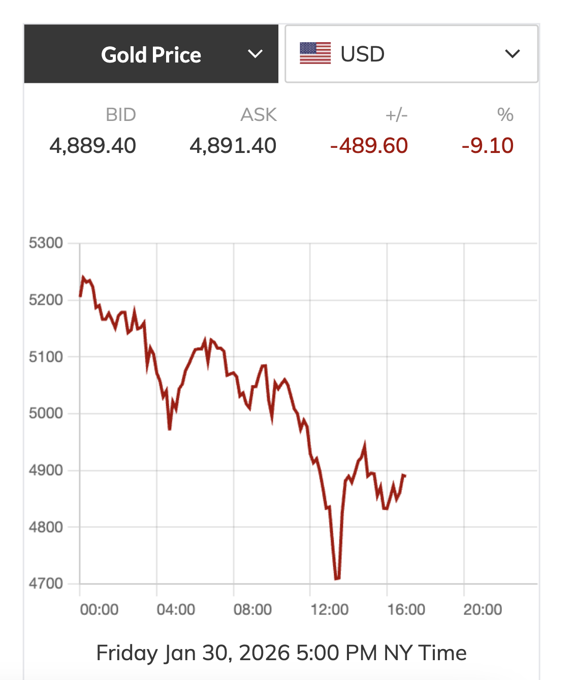 Đóng cửa cuối tuần, giá vàng hôm nay dừng ở mức 4.891 USD/ounce, mất tổng cộng gần 500 USD/ounce trong một phiên. Nếu tính từ mốc đỉnh trên 5.600 USD/ounce, giá vàng đã mất tới hơn 700 USD/ounce (tương đương mức giảm tới 22 triệu đồng/lượng).