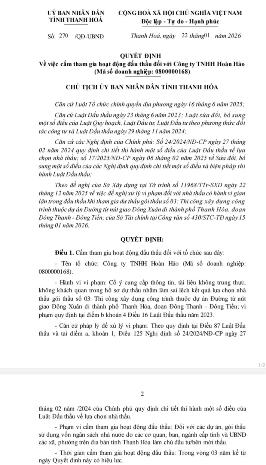 Nội dung quyết định nêu rõ, Công ty TNHH Hoàn Hảo (mã số doanh nghiệp 0800000168) đã có hành vi cố ý cung cấp thông tin, tài liệu không trung thực, không khách quan trong hồ sơ dự thầu, nhằm làm sai lệch kết quả lựa chọn nhà thầu gói thầu số 03: Thi công xây dựng công trình thuộc dự án Đường từ nút giao Đông Xuân đi TP. Thanh Hóa, đoạn Đông Thanh – Đông Tiến.