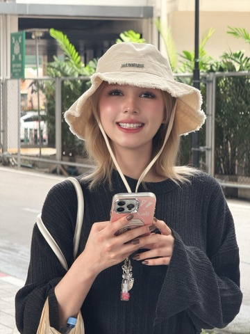 Trong ảnh, Xoài Non diện trang phục đơn giản, đội mũ rộng vành của Jacquemus. Cô trang điểm nhẹ nhàng, tay cầm điện thoại và nở nụ cười tươi tắn.