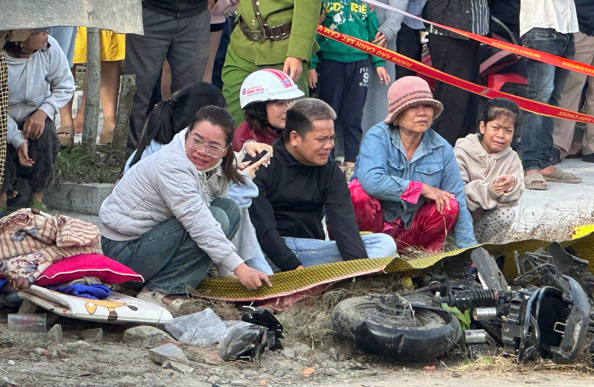 Tại hiện trường, nhiều xe máy bị hư hỏng nặng, nằm ngổn ngang trên mặt đường. Vụ tai nạn khiến hai người tử vong tại chỗ, trong đó có một học sinh và một phụ nữ đi chợ.