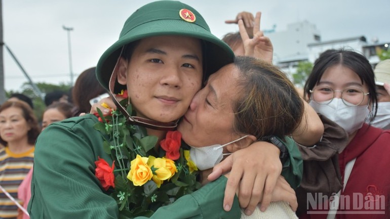 Khoảnh khắc mẹ và con trai tại Lễ giao nhận quân. |