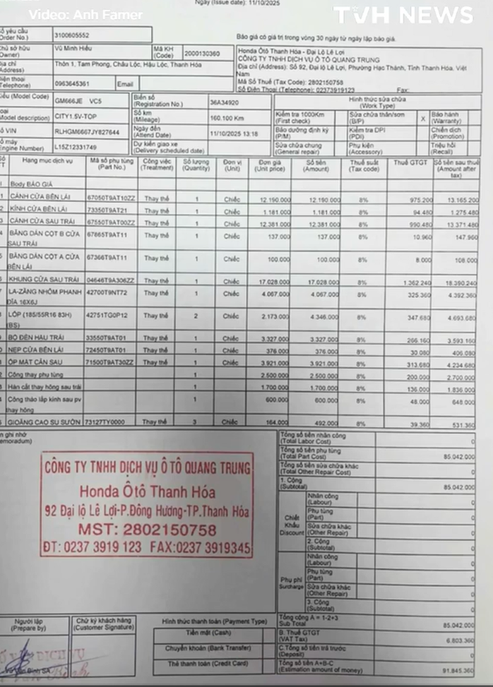 "Sau khi thương lượng, thỏa thuận, chủ xe ô tô nói đưa vào hãng tại Thanh Hóa để sửa chữa. Sau khi giám định, thiệt hại là 73 triệu đồng. Một thời gian sau, hóa đơn nhảy lên là 91 triệu đồng. Nhờ cộng đồng mạng giúp em với giá phụ tùng, dịch vụ như vậy có hợp lý chưa" - thông tin chia sẻ trên mạng xã hội.