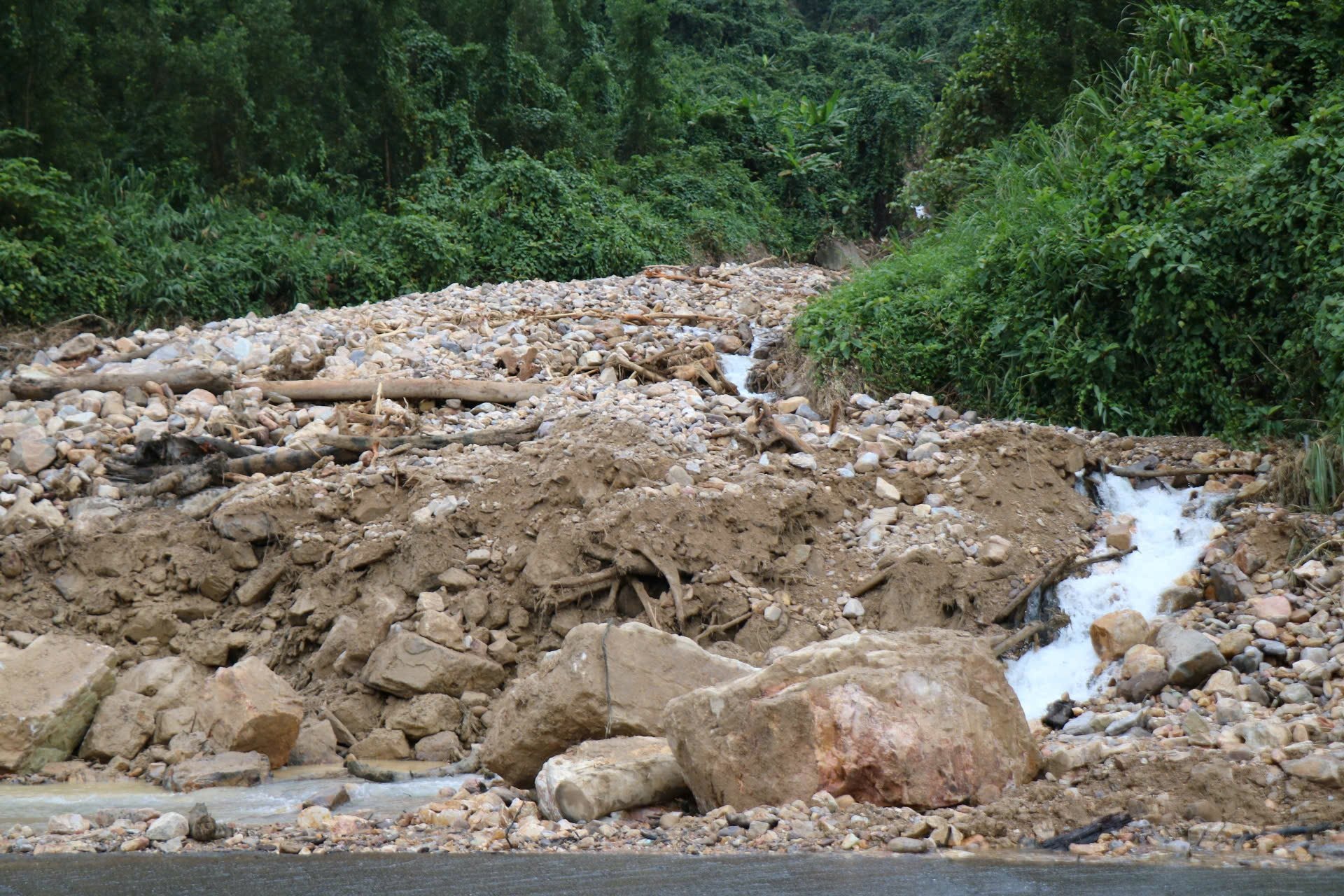 Do mưa lớn kéo dài, một lượng đất đá lớn đã trượt lở xuống đường |