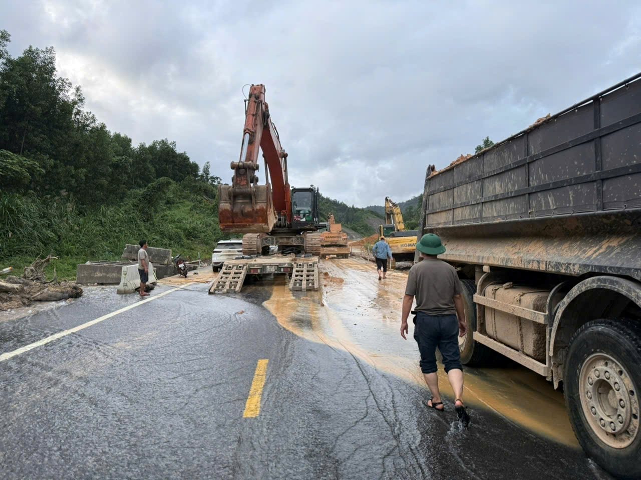 Các phương tiện dọn dẹp đất đá sạt lở đến sớm thông toàn tuyến |