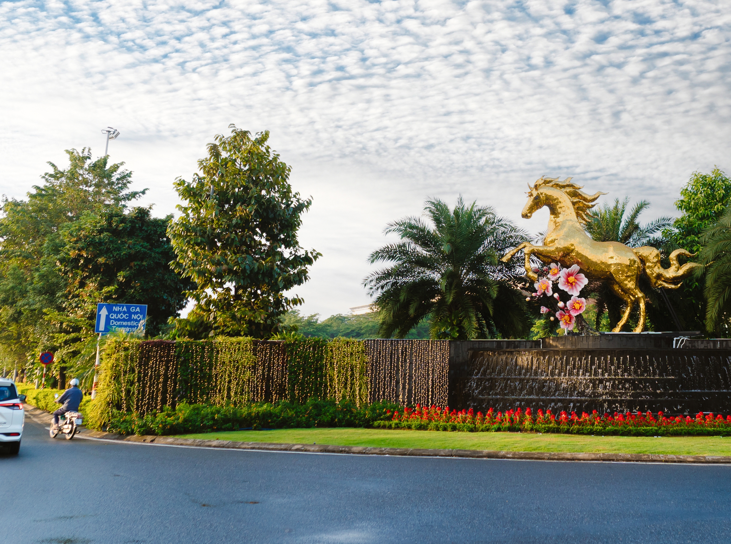 Bên dưới linh vật được điểm xuyết cành hoa xuân, góp phần tạo nên không khí Tết rộn ràng ngay từ cửa ngõ hàng không của thành phố.