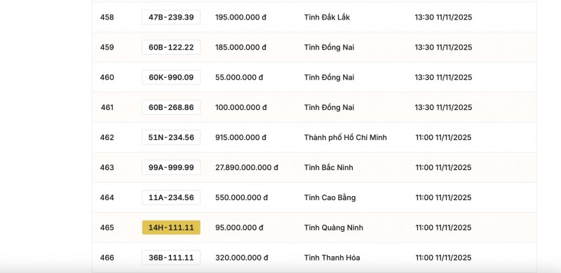 Nhiều biển số có trúng đấu giá cao trong ngày 11/11. Ảnh chụp màn hình |