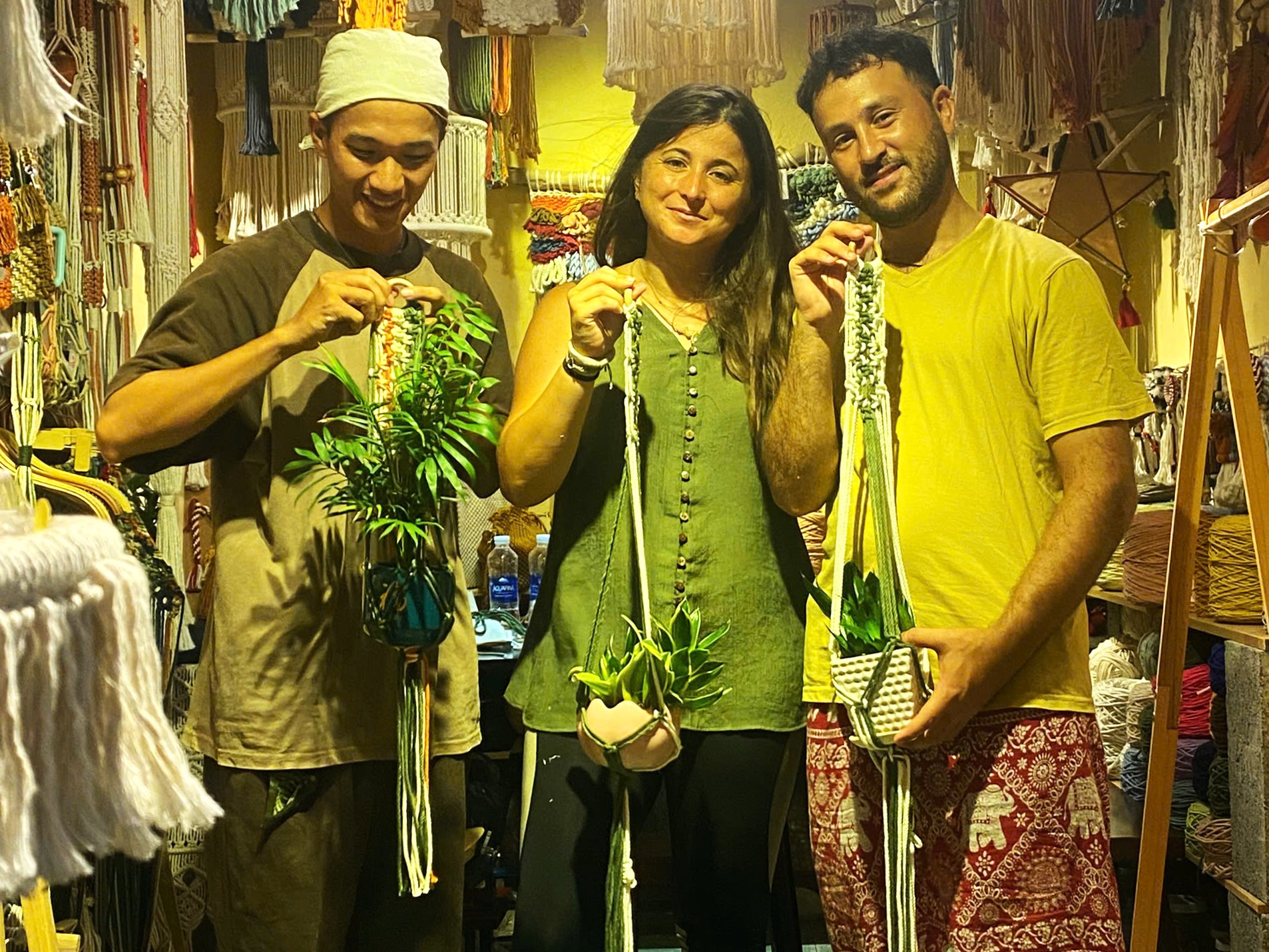 Những sản phẩm macrame độc đáo mà chàng trai Huỳnh Kim (bìa trái) hướng dẫn du khách vừa mang giá trị nghệ thuật, vừa gửi đi thông điệp sống xanh và sáng tạo bền vững.