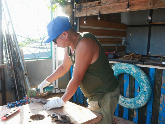 Anh Nguyễn Thành Long tỉ mỉ mài giũa từng loại rác thải từ biển để “hồi sinh” chúng thành vật dụng trang trí cho quán cà phê của mình.