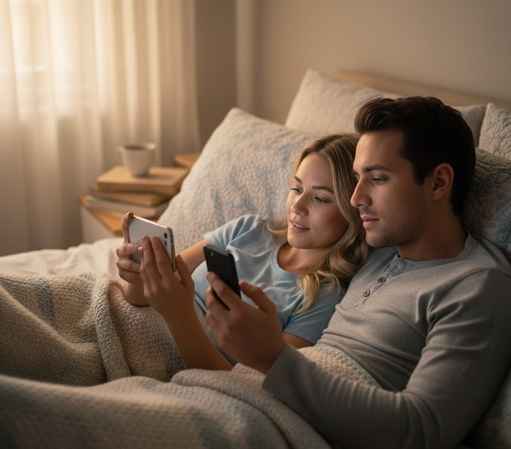 Thói quen xem điện thoại trên giường đang tạo ra một "bức tường công nghệ" vô hình giữa bạn và đối tác. (Ảnh minh hoạ AI) |