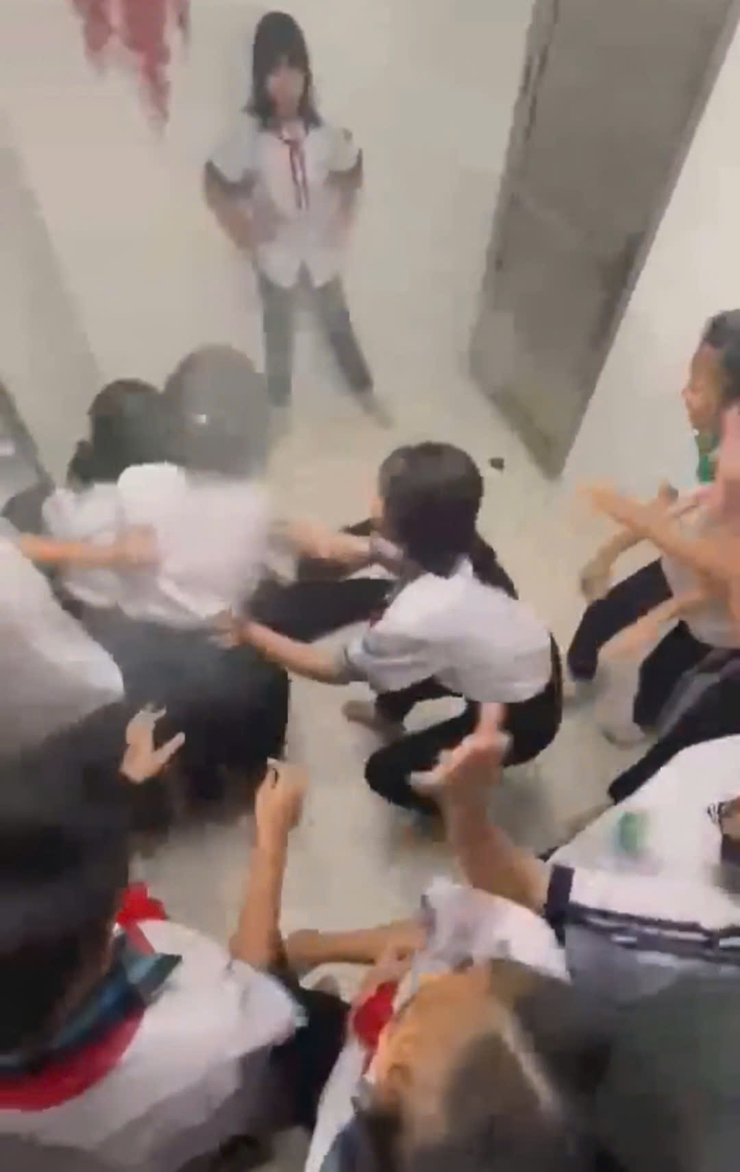 Theo clip ghi lại, nữ sinh bị nhóm bạn vây xung quanh ở một phòng vệ sinh, rồi chỉ mặt bạn và nói lời thô tục. Không dừng lại ở đó, cả nhóm nữ sinh xông vào đánh hội đồng em này.