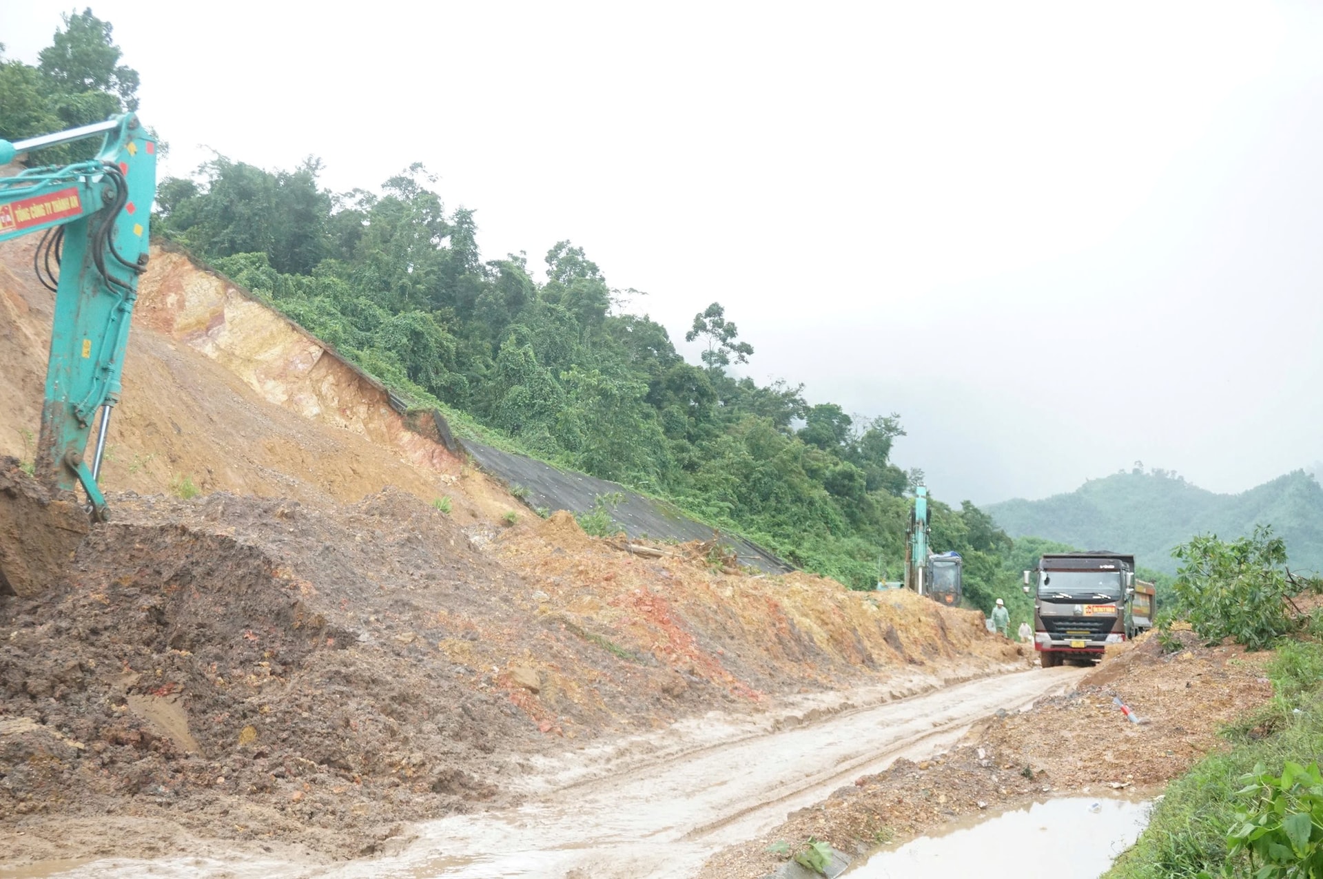 Mái taluy cao, địa hình dốc, đất yếu kết hợp mưa kéo dài khiến nền đường và kết cấu rãnh thoát nước bị phá vỡ, tiềm ẩn nguy cơ tiếp tục trượt sạt. Các đơn vị thi công đã bố trí máy đào, xe ben hoạt động liên tục 24/24h, đồng thời khoan neo và phun bê tông tạm thời để gia cố mái taluy.