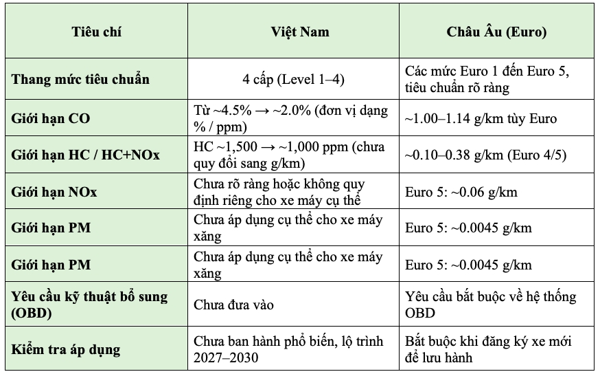 Châu Âu có bộ tiêu chuẩn khí thải rõ ràng và cụ thể hơn đối với xe máy, với giới hạn định lượng cho CO, HC, NOx và cả PM, áp dụng theo quy trình thử chuẩn hóa (WMTC / ECE) và đã được ban hành áp dụng rộng rãi từ nhiều năm nay. Việc ban hành quy chuẩn khí thải lần này là tiền đề để Việt Nam kiểm soát hơn về lượng khí thải ra môi trường hàng tuy nhiên chủ yếu vẫn dựa trên mức giới hạn linh hoạt theo tuổi xe và chưa có hiệu lực phổ biến rộng như Euro.