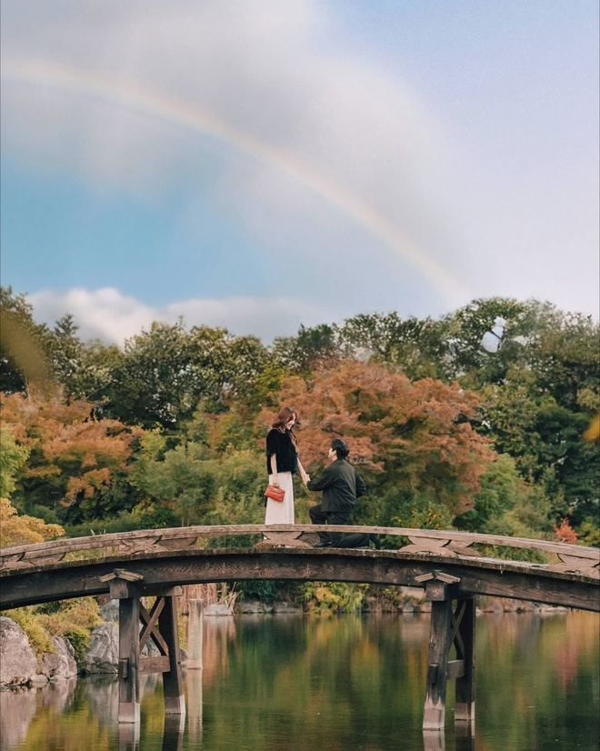 Trong bức ảnh được chia sẻ, Chloe Nguyễn rạng rỡ đứng trên cây cầu gỗ nhỏ bắc qua mặt hồ phẳng lặng, phía xa là cầu vồng vắt ngang bầu trời. Zim quỳ gối trao nhẫn cầu hôn trong khoảnh khắc lãng mạn.
