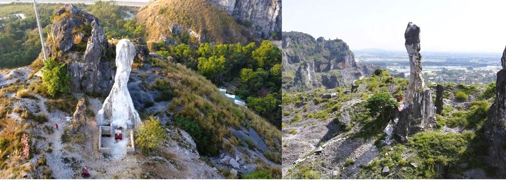 Hòn Vọng Phu sau khi gia cố (trái) và lúc chưa gia cố (phải). Ảnh: Tuấn Minh |