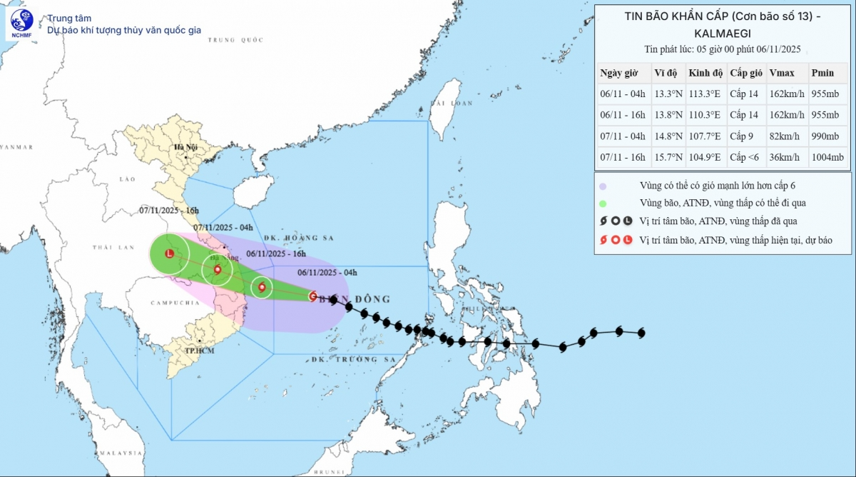 Theo Trung tâm Dự báo Khí tượng Thủy văn Quốc gia, rạng sáng 6/11, bão số 13 chỉ còn cách Quy Nhơn, Gia Lai 450km và chiều tối nay sẽ áp sát đất liền.