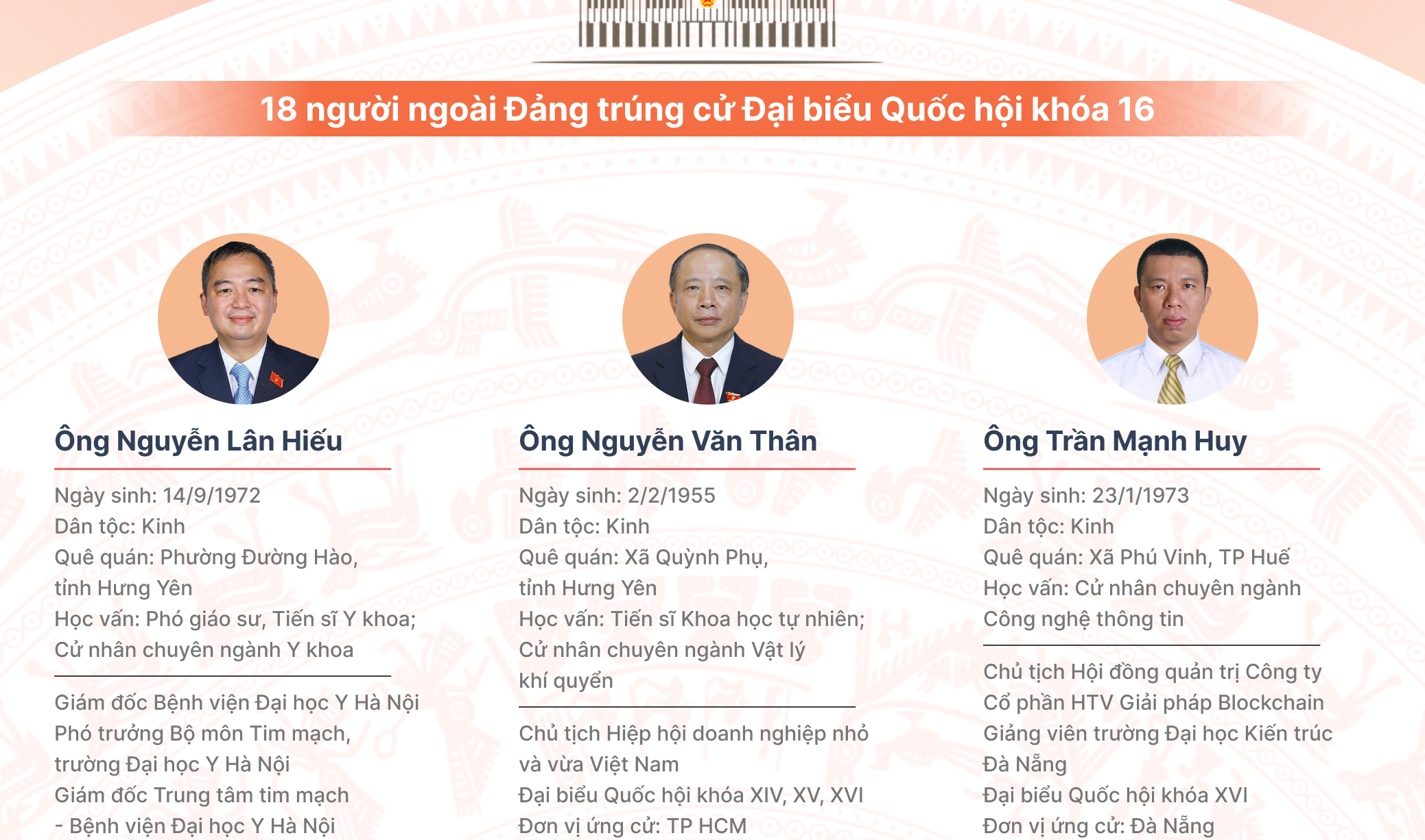 Trong số 18 người ngoài Đảng trúng cử Đại biểu Quốc hội khóa 16 có PGS Nguyễn Lân Hiếu, 5 doanh nhân, 3 lãnh đạo Giáo hội Phật giáo Việt Nam và 2 linh mục Công giáo.