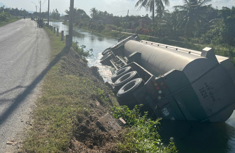 Trong lúc đang vận hành trên đường bộ, một chiếc xe tải kéo rơ moóc có bồn chuyên dụng chở dầu bất ngờ lao xuống kênh thủy nông bên đường.