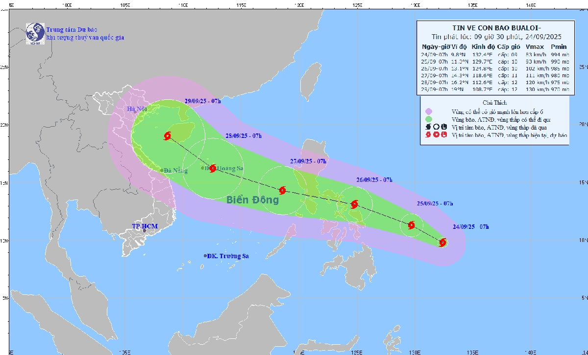 Hồi 7h ngày 24/9, tâm bão ở khoảng 9,8°N – 132,4°E. Sức gió mạnh nhất gần tâm cấp 9 (75–88 km/h), giật cấp 11. Di chuyển theo hướng Tây Tây Bắc, tốc độ khoảng 15 km/h. Dự báo khoảng đêm 26/9, bão sẽ đi vào Biển Đông và trở thành cơn bão số 10 năm 2025.
