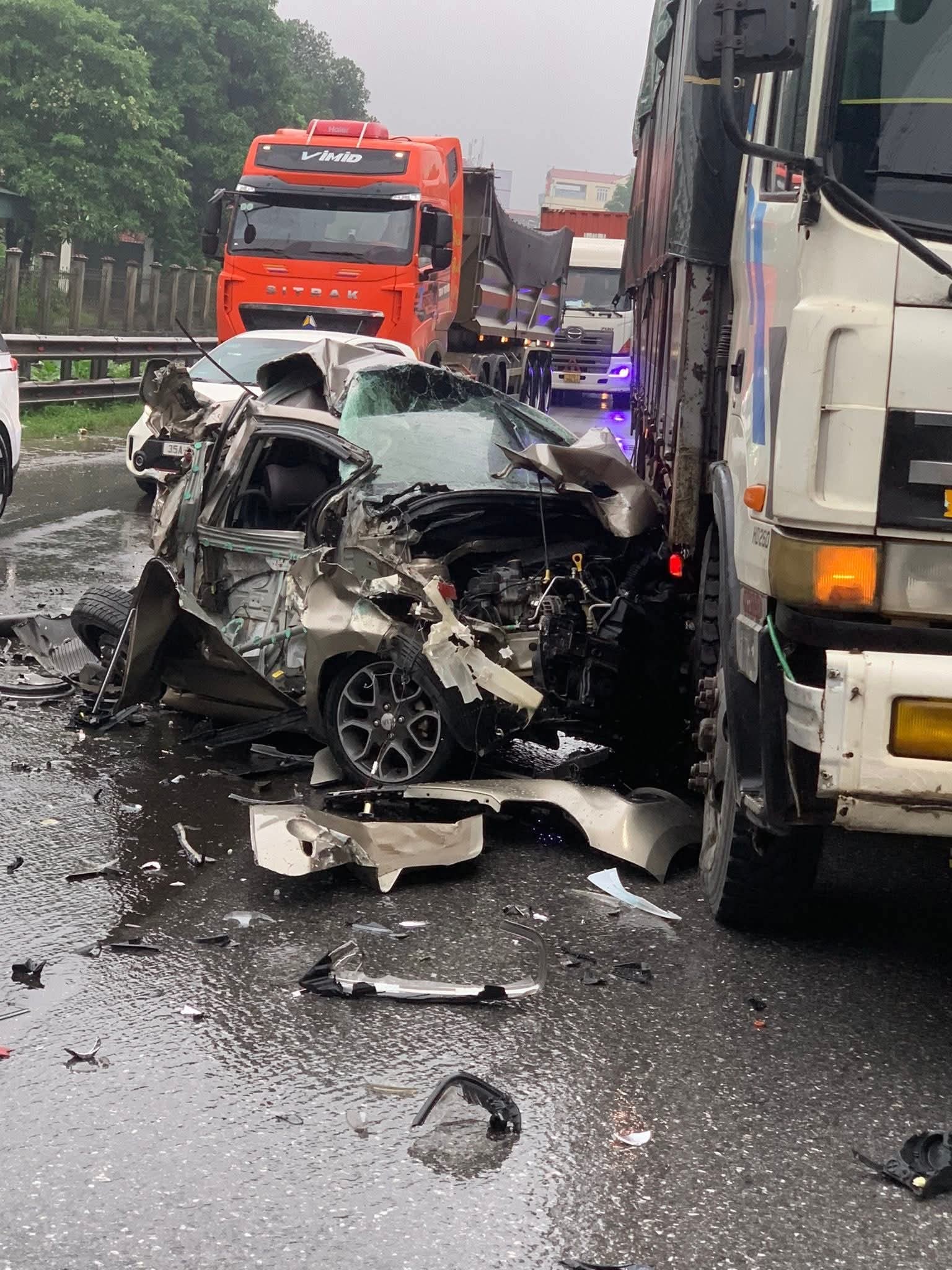 Cú va do xe đầu kéo đâm vào đuôi xe con, khiến chiếc xe con văng mạnh vào gầm sau xe tải. Cả 3 phương tiện bị hư hỏng.