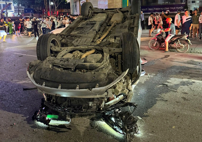 Tại hiện trường, cú tông mạnh khiến chiếc Lexus bị lật ngửa, phần đầu và đuôi xe biến dạng, nhiều mảnh vỡ văng khắp mặt đường.