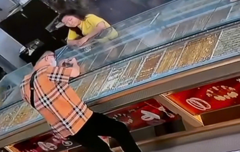 Theo camera của tiệm vàng ghi lại vào trưa 4/11, một đối tượng mặc áo sọc ca-rô, đeo khẩu trang đi bộ vào trong tiệm vàng. Sau khi quan sát phía trước không thấy bảo vệ, bên trong tiệm vàng vắng người, đối tượng tiến đến quầy trưng bày hỏi nữ chủ tiệm mua một chiếc nhẫn size lớn, loại 1 lượng.